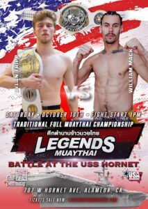 Willy Mack steps up to face the champion Dylan Tripp in a 5 round title fight at Legneds Muay Thai on the USS Hornet. Get tickets and watch live this is a fight you don’t want to miss.